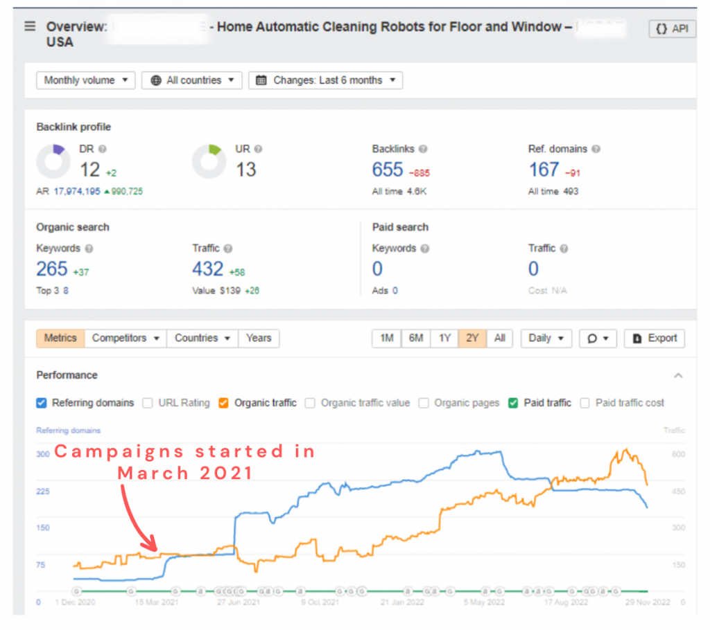 The strategy proved successful, resulting in a 195% increase in organic traffic within the first year. The campaigns, which included a mix of 2 premium and 28 standard campaigns, generated more than 210 high-quality backlinks according to Ahrefs from reputable sources such as mainstream news sites, YouTube, Vimeo, podcast directories, and popular blogs.